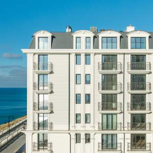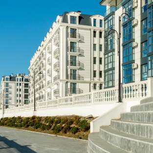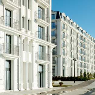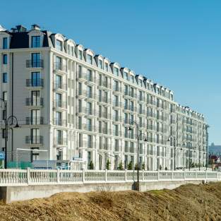 Верхние этажи решены в формате мансард, что добавляет фасадам динамику, а люкарны визуально и функционально расширяют пространство резиденций. Образ дополняют элементы классической европейской архитектуры. Фасады выходят на современную благоустроенную набережную и вместе с ней формируют цельный, гармоничный архитектурный ансамбль.