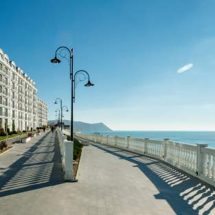 Белоснежные фасады подчёркивают фактуру материалов и эффектно контрастируют с тёмными коваными элементами. Широкие панорамные окна с одной стороны ловят отражение морской глади, с другой открывают виды на горы и море. Вся архитектура отсылает к атмосфере Сен-Тропе 60-х годов — спокойной, выверенной, без гонки за трендами, где на первом месте аутентичность и настоящие ценности.